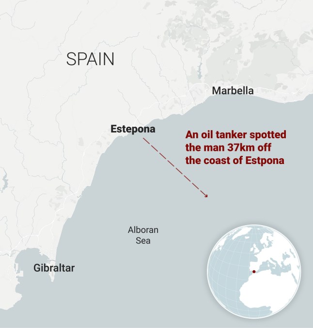 An oil tanker spotted the man 37km off the coast of Estpona after crew members thought they saw a ‘lost toy’ (Picture: Metro graphics)
